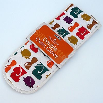 The Silhouette double oven gloves from Royal Stafford feature a colourful contemporary design of kitchen utensils which matches in with the storage jars and other kitchen textiles for a fresh new kitchen look. The oven mitts are made from 100% cotton and measure 84 x 17.5cms.